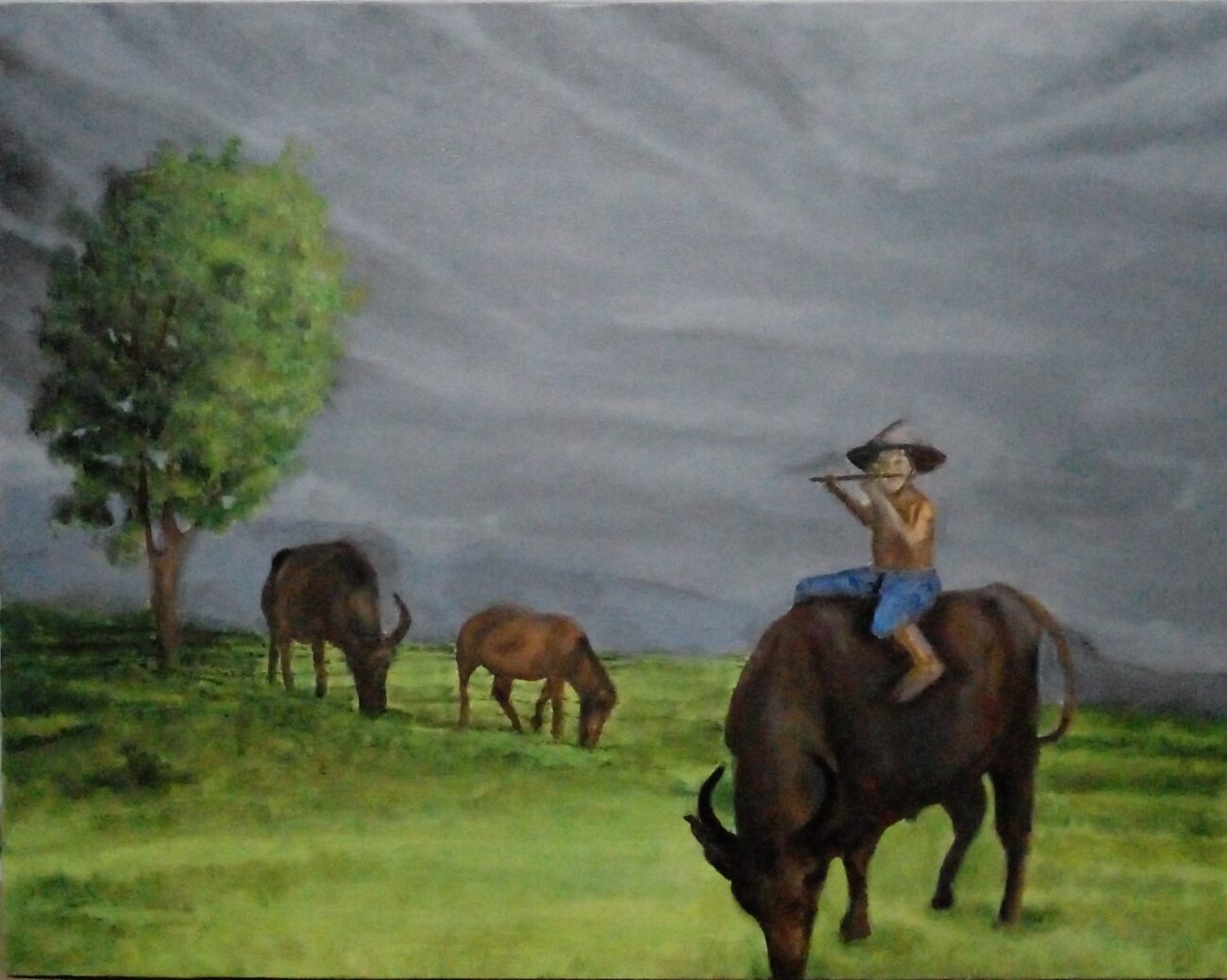 Sebuah lukisan menawan menggambarkan kehidupan pedesaan yang tenang dan penuh makna. Seorang anak gembala duduk di atas punggung kerbau besar, memainkan seruling dengan santai. Dua ekor kerbau lainnya tampak merumput di hamparan padang rumput hijau yang luas, menciptakan suasana damai. Di sisi kiri lukisan, sebuah pohon besar berdiri kokoh, menambah nuansa alami dan keseimbangan komposisi. Langit yang sedikit mendung memperkuat kesan dramatis tanpa mengurangi ketenangan yang terpancar.
